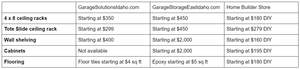 For garage storage and organization there are three pricing tiers of options: